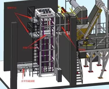 放置在托盤上的包裝廢料通過叉車上料到底部水平輥道上(根據(jù)需要設(shè)置幾段水平輥道,水平輥道可作為存料區(qū)以備提高整個系統(tǒng)的工作效率),托盤自動輸送到提升機底部轎廂上后,垂直提升到提升機最上端,傳感器接收到信號,密封艙第一道密封門打開,托盤自動滾入密封艙,然后第一道密封門關(guān)閉,密封艙內(nèi)部充氮置換出空氣,達到設(shè)置值后密封艙第二道門打開,廢料進入破碎區(qū)域,氧氣分析系統(tǒng)工作,氧含量達標后破碎系統(tǒng)啟動破碎廢料,破碎完成后溜槽底部密封閘板打開破碎完后的廢料進入接料箱,接料箱接滿料后轉(zhuǎn)入料坑,同時另外一個提升-破碎循環(huán)開始。